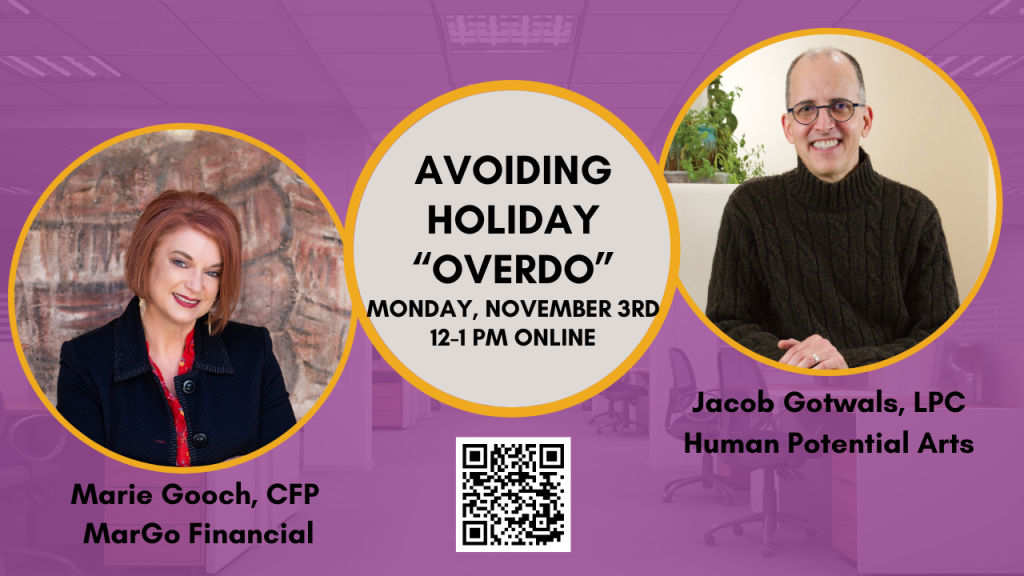 The holidays often come with too much — too many commitments, too much spending, too much stress. Join Marie Gooch, CFP of MarGo Financial and Jacob Gotwals, LPC, of Human Potential Arts, for a unique online workshop that blends financial and emotional wellness. Together, we’ll share practical tips to set healthy boundaries, manage holiday expectations, and keep your finances and relationships on track — so you can focus on what really matters this season.